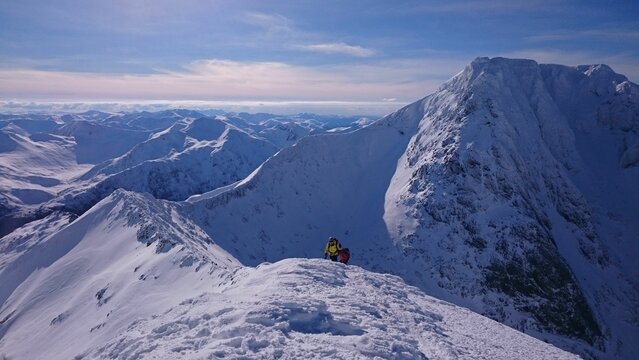 Aerial shot of two hikers standing on a snowy peak of mountain