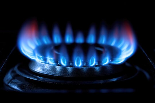 Kitchen gas stove with burners lit.  Illuminated blue flames on two stovetops against a tiled wall.  Modern, clean design