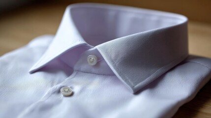 Close-up of a light purple button-down shirt. the shirt is folded neatly and the collar is visible. there are two white buttons on the left side of the collar.