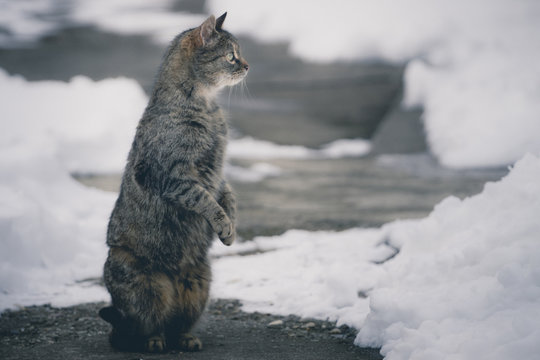 Weathered marble feet of classical sculpture resting on cracked plinth, closeup