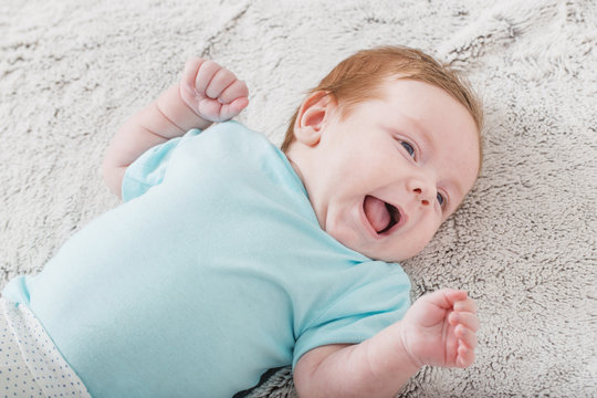 close-up of a baby girl 2 months old, lies on her stomach with a rattle, looks at the camera, the concept of newborn, infancy