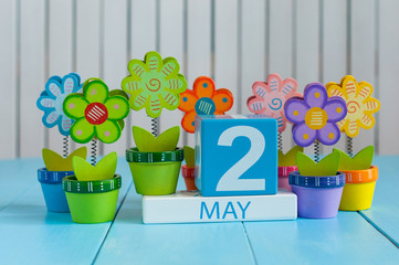 May 2nd. Image of may 2 wooden color calendar on white background with flowers. Spring day, empty space for text.  last spring month