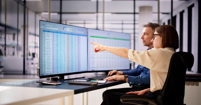 Two busy professional business people working in office with laptop computer. Mid aged mature Latin female executive manager talking to male colleague having conversation sitting at workplace.