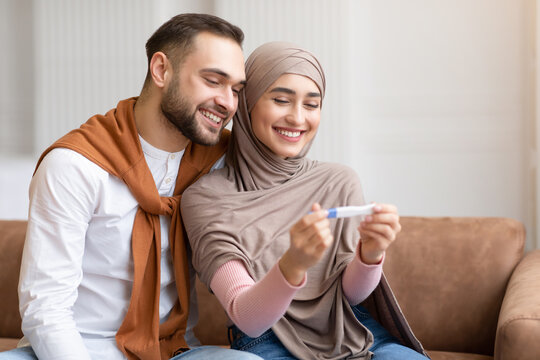 Happy Muslim Couple Holding Positive Pregnancy Test Sitting At Home