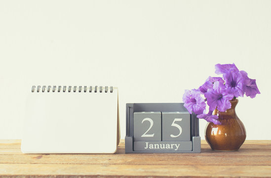 vintage wood calendar for january day 25 on wood table with empt