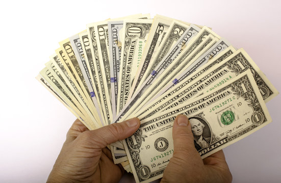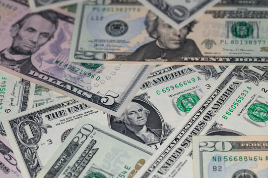 5, 20, 50, 100 dollars banknotes at different angles. Close up of dollars on white background.