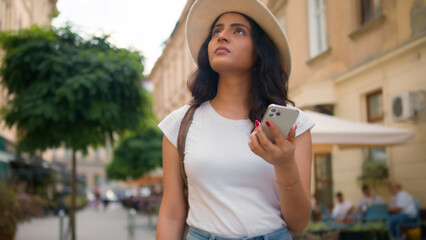 Upset Indian Hispanic ethnic woman female tourist traveler lady lost on city street abroad looking around searching use cellphone GPS app online find explore town smartphone problem confusion outside