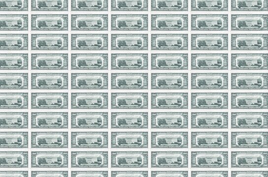 20 US dollars bills printed in money production conveyor. Collage of many bills. Concept of currency devaluation
