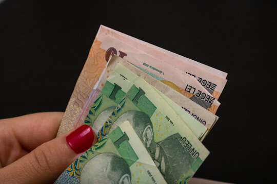 Selective focus on detail of LEI banknotes. Counting or giving Romanian LEI banknotes. World money concept, inflation and economy concept