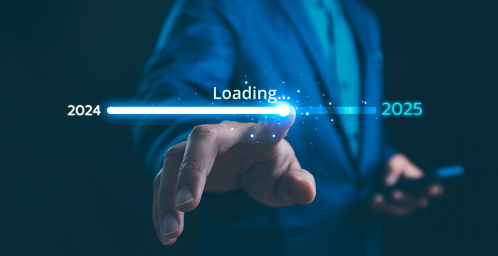 Businessman touch on loading progress from 2023 to 2025,Planning and challenge strategy in new year 2024 Concept. New business startup to 2025. New year 2025 is loading, calendar date, end of the year