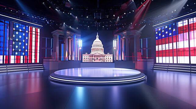 Empty chair at political tv debate with candidates on stage, talking heads moment