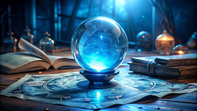 Mysterious ancient crystal ball illuminated by soft blue light, surrounded by cryptic manuscripts and eerie shadows, foretelling an uncertain 2024 futuristic prophecy.
