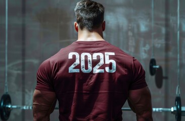 Rear view of muscular man wearing maroon t-shirt with the number 2025 printed on the back, standing in a gym with weightlifting equipment in the background