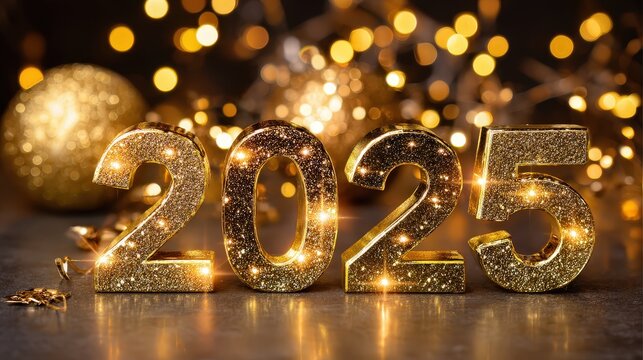 Golden 2025 numbers with festive bokeh lights.