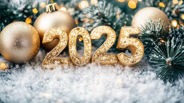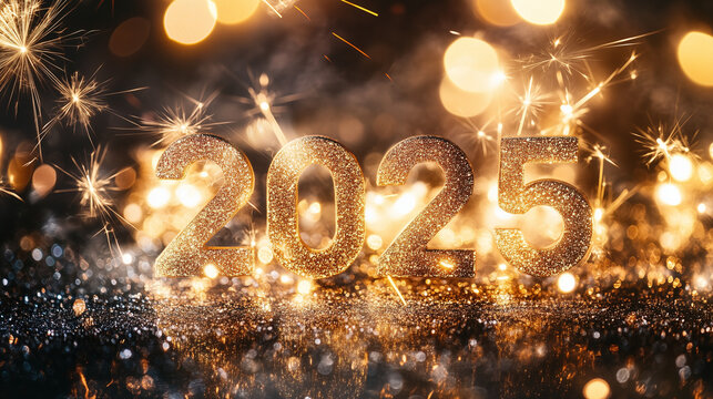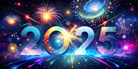 A whimsical night sky filled with shooting stars, fireworks, and a glowing “2025”new year