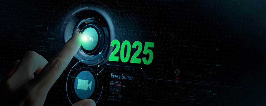 Finger Pressing Start Button for 2025 in Futuristic Digital Interface