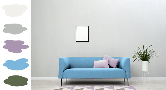 Cozy living room with sofa, houseplant and decor. Interior design with color of 2026 year and matching shades palette