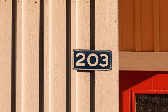 Closeup of house number 203 on white concrete wall