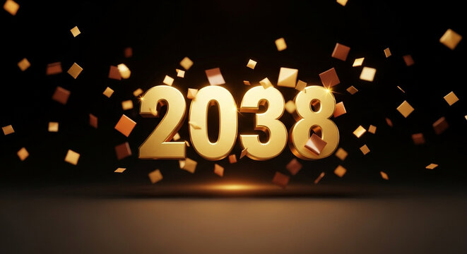 Golden 2038 numerals with sparkling confetti create a celebratory future forward announcement effect