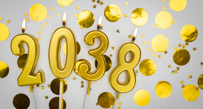 New Year greeting card. background Happy New Year 2038. Golden candles with numbers of year 2038 on festive decor background.
