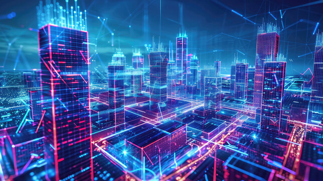Futuristic display showing global market trends in 2077 over a cityscape