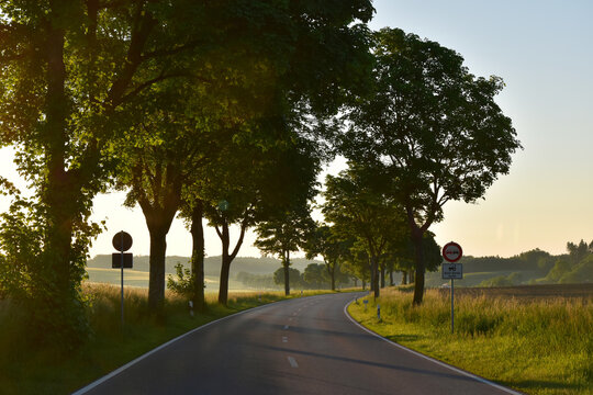 Straßenbäume, Baumallee. Straßenbäume, Baumallee  entlang der ST.2084 zwischen Eberspoint und Thalhausen im Gegenlicht der Morgensonne, Landkreis Freising