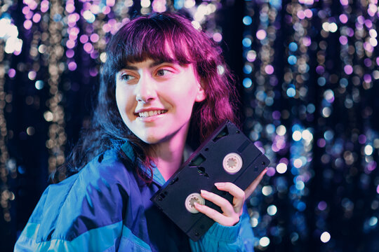 Young sporty woman 80 and 90's style. 90s positive girl with cassette dvd
