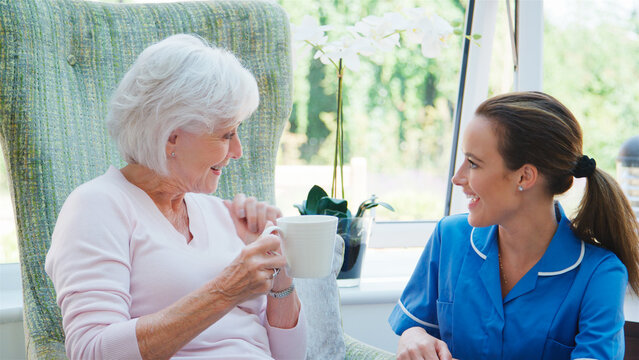 Male And Female Residents Sitting In Chair And Talking With Nurse In Retirement Home