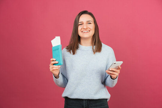 Excited woman has just checked in online on the phone while holding passport. Studio shot over pink wall.