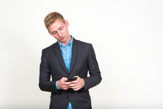 Portrait of young handsome blond businessman in suit using phone