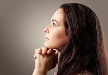 An asian woman desperately prays for a miracle while looking up to the heavens. A lady in her 20s sitting on a bench praying.