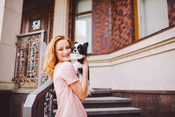 A beautiful young woman with red long hair is holding a small, cute funny big-eyed dog of two flowers, a black-and-white pet of the breed of hichuahua against a house of red brick in summer