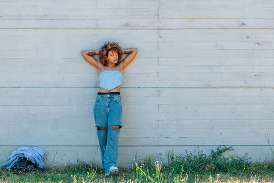relaxed latin girl leaning on street wall outdoors