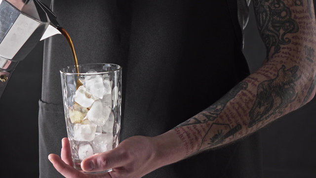 A man with a tattoo pours coffee in a glass with ice around a dark background. 4K UHD video, 2160p.