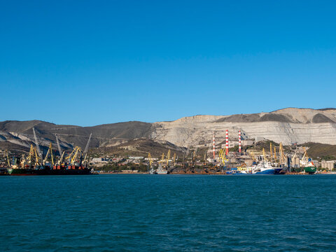 August 22 2025 View of Novorossiysk port Russia with cargo ships and cranes on the coastline. Industrial maritime scene on the Black Sea