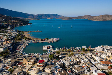 ELOUNDA, CRETE, GREECE - 22 AUGUST 2020: Aerial view of the popular Greek town and port of Elounda on the island of Crete