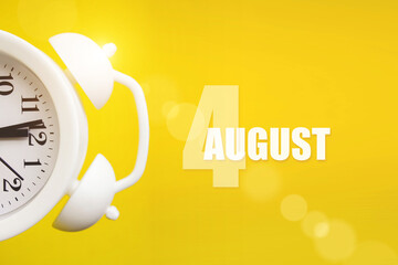 August 4th. Day 4 of month, Calendar date. White alarm clock on yellow background with calendar day. Summer month, day of the year concept.