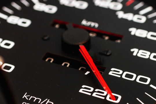Car speedometer. Auto car speedometer shows 220 km h or miles.Closeup shot,dark black background.Automobile dangerous speed concept