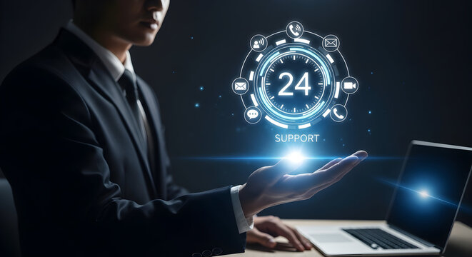 Man in suit holding holographic 24/7 support service clock with glowing green text.
