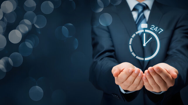 24/7 customer service concept with businessman holding digital clock icon, representing nonstop support, online assistance, client care, business availability, contact center and service reliability.