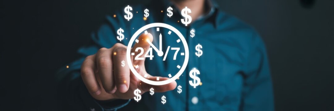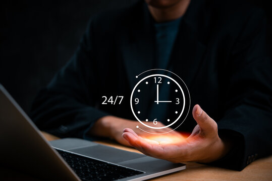 Nonstop worldwide service concept. Businessman uses laptop with virtual 24-7 with a clock for full-time available contact of service concept. Customer service, ready for customer care, contact us.