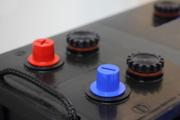New car battery accumulator with red plus and blue ground pins close up, maintenance, charging
