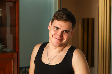 A portrait of a young man with short brown hair and blue eyes, wearing a black tank top and a silver chain with a cross. young man 25 years old smile indoor face