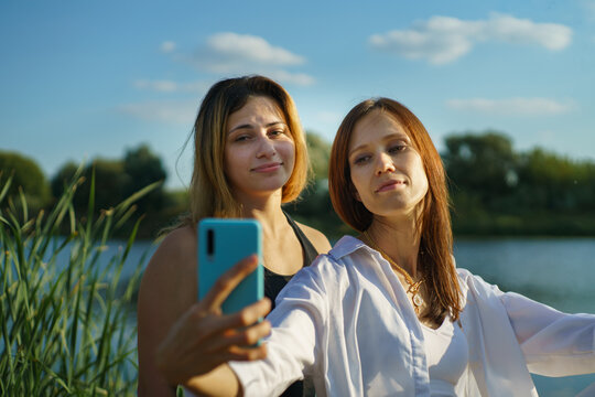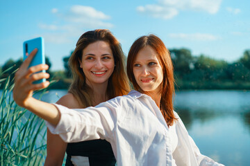 Cheerful happy women friend in nature take selfie by smartphone. Selective focus