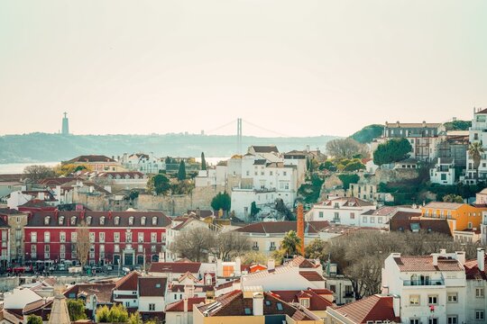 Lisbon cityscape with Cristo Rei and 25 de Abril Bridge.