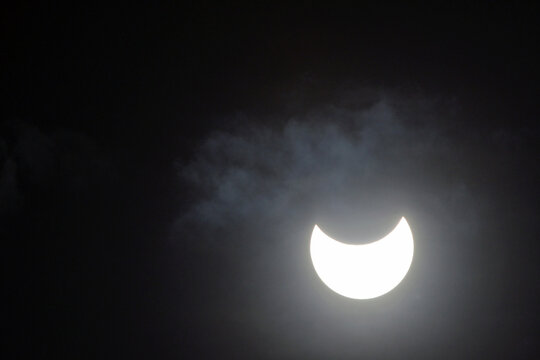 Partial solar eclipse behind clouds. The moon partially covers the sun. Natural, rare phenomenon seen 25 October 2022.