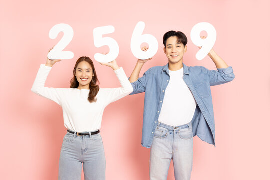 Happy Asian couple holding 2569 numbers isolated on pink background, New year Buddhist era concepts