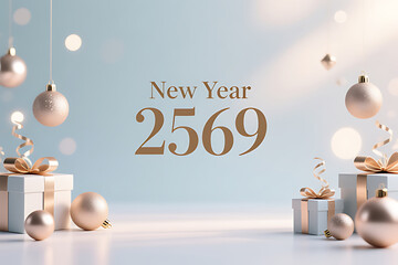 New Year 2569 modern greeting card backdrop with soft-floating elements, atmospheric glow, artistic gradient palette, contemporary minimalist arrangement