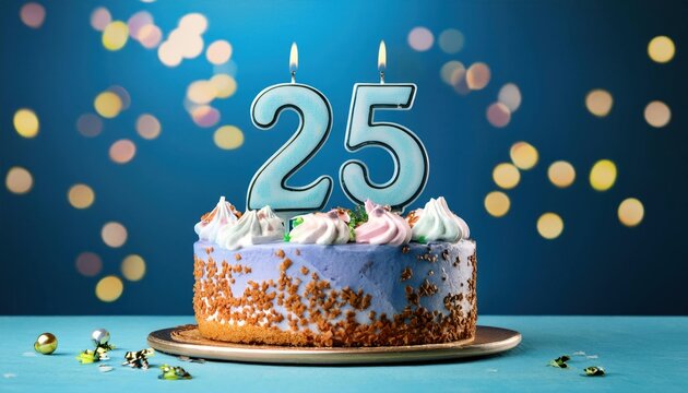 Happy 25th Birthday Cake with Candles and Blue Backdrop