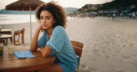 Adult woman sitting at round wooden table on sandy beach by the sea, at a beach restaurant or beach bar, tanned skin, slim and attractive, age 26 to 36